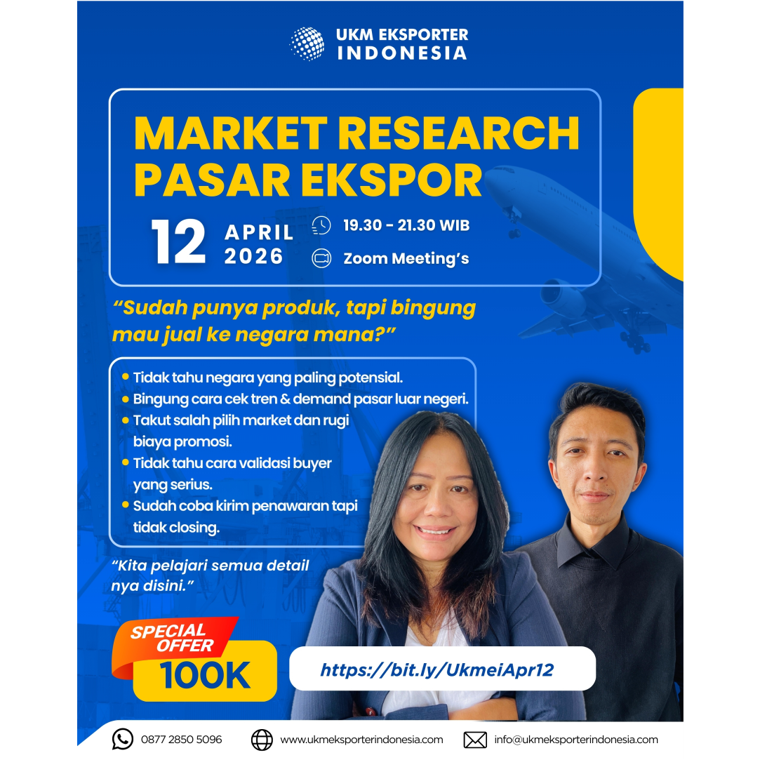 UKM Eksportir Indonesia dengan bangga mempersembahkan WEBINAR EXPORT, dengan tema “MARKET RESEARCH PASAR EKSPOR “. Sebuah Kelas Ekspor Online yang dirancang khusus untuk Langkah dalam menentukan pasar yang tepat bagi produk indonesia di mancanegara..