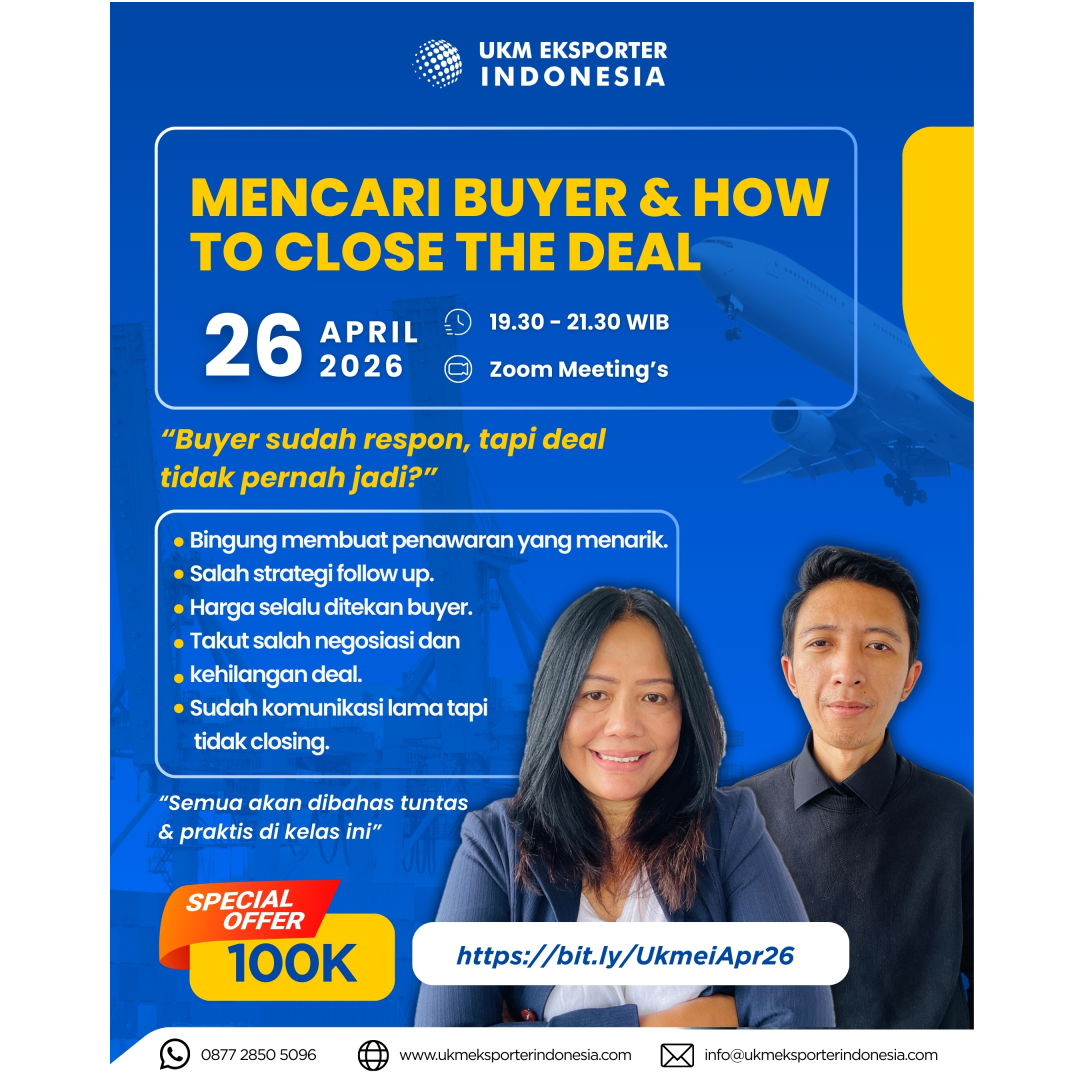 UKM Eksportir Indonesia dengan bangga mempersembahkan WEBINAR EXPORT, dengan tema “MENCARI BUYER DAN HOW TO CLOSE THE DEAL “. Sebuah Kelas Ekspor Online yang dirancang khusus untuk menentukan Strategi Menemukan Potensial Buyer, Negosiasi Buyer serta membuat penawaran menarik bagi buyer.