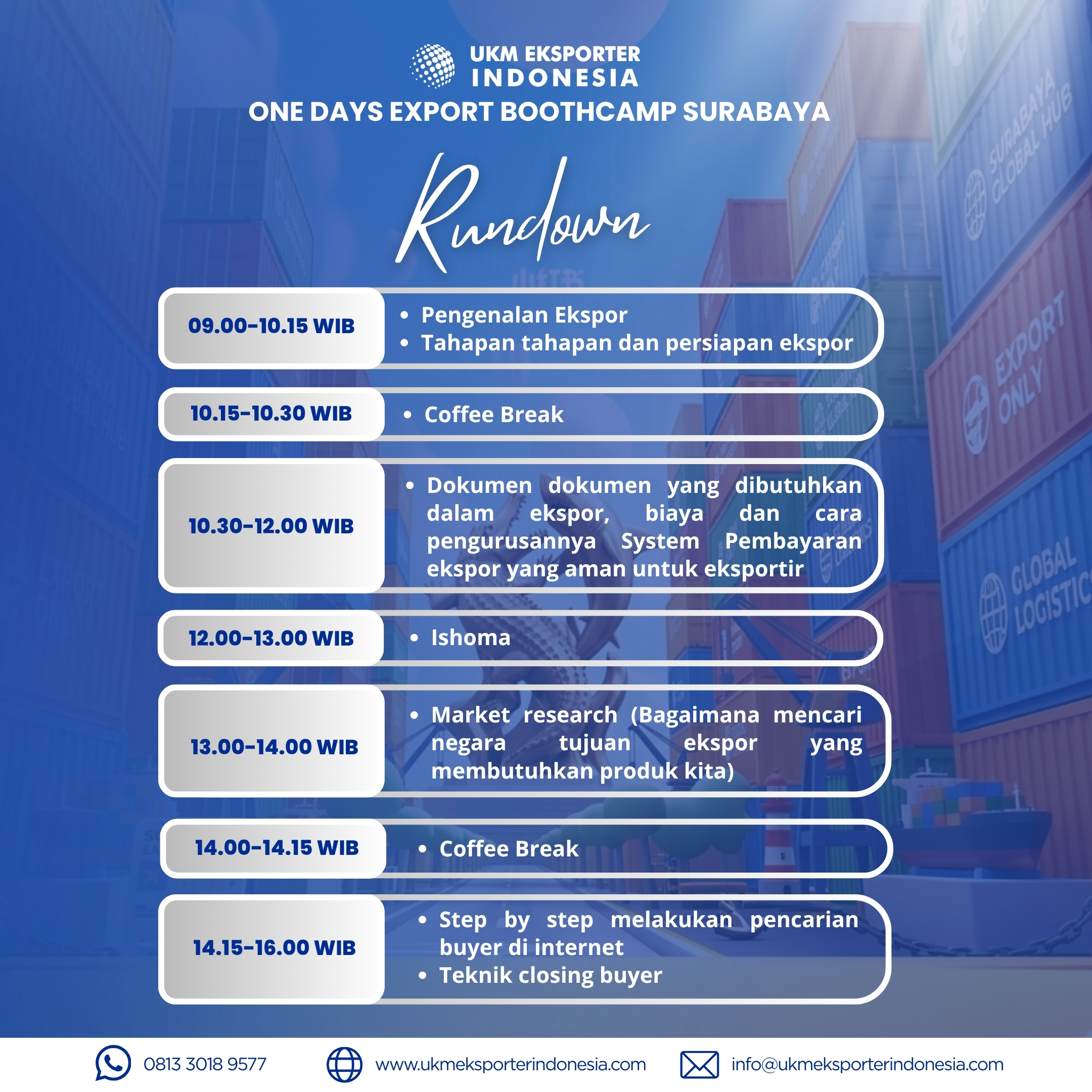 Sobat UMKM, Apakah kalian ingin memulai bisnis ekspor tapi tidak tahu harus mulai dari mana? Jangan khawatir! Kami hadir dengan Kelas Ekspor Offline yang dirancang khusus untuk kalian yang ingin mempelajari dasar-dasar ekspor dan memulai karir sebagai eksportir