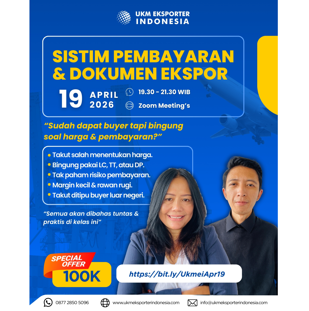 UKM Eksportir Indonesia dengan bangga mempersembahkan WEBINAR EXPORT, dengan tema “SISTIM PEMBAYARAN & DOKUMEN EKSPOR”. Sebuah Kelas Ekspor Online yang dirancang khusus untuk Membuat dan Menyusun Dokumen-Dokumen Yang perlu di persiapkan untuk Ekspor..